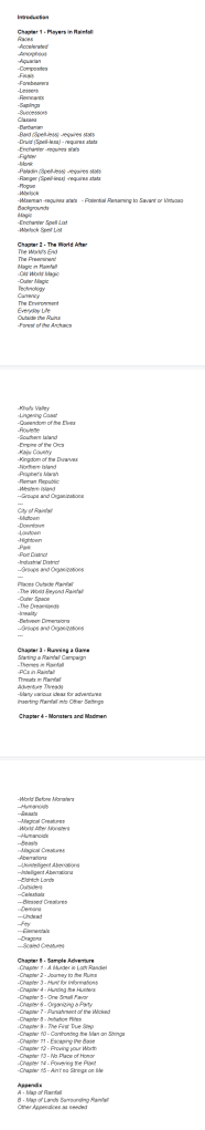 With all that in mind, what does development of Rainfall look like from here? To talk a bit about that, here is the draft table of contents I use to organize my internal documents. Each of the entries here on this list are separate google docs I have laying around and this helps me keep straight where each one fits and what still needs to be done.