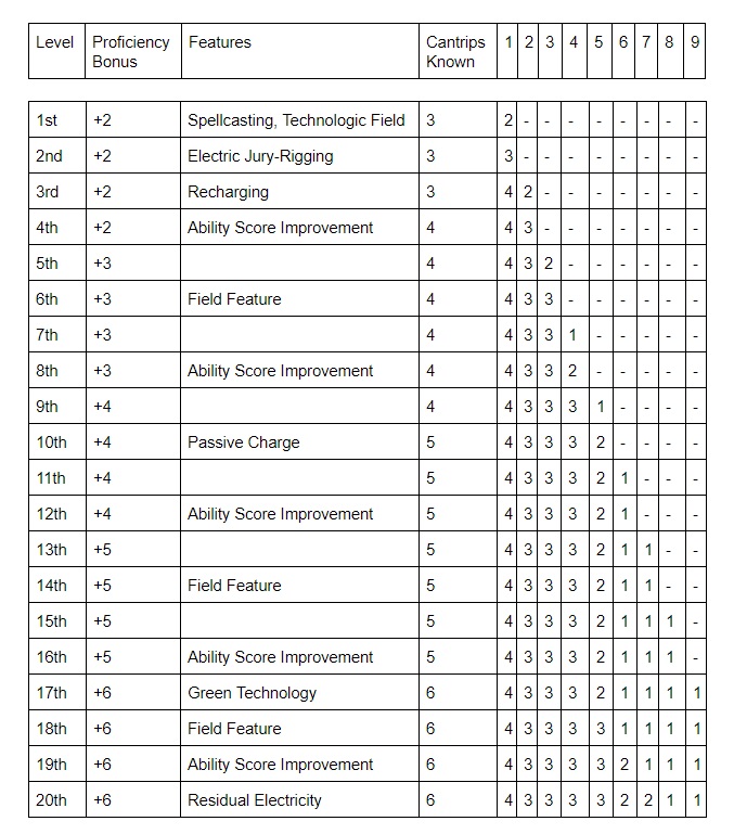 These two concepts translate nicely into some D&D concepts that people should be familiar with for casters. When an Enchanter prepares their spells for the day, they’re doing maintenance to make sure their Devices will still work. Their spell slots represent how much electricity they have generated and stored up in power cells. When an Enchanter casts a spell, they are powering up a Device they have repaired and using the electricity stored in their power cell to make the effect happen. Obviously more impactful spells require more power to operate and thus higher level spell slots.